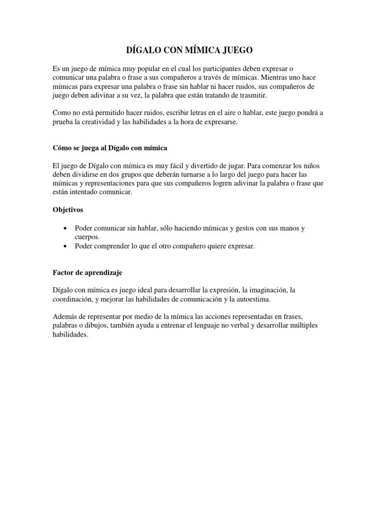 También muy conocido como charadas o mímicas, este popular juego consiste en realizar movimientos o gestos para comunicar una palabra o frase específica al . Juegos digalo con mimica voltear fichas. Representar con mímica la palabra para que todos los equipos lo adivinen 3. El juego de dígalo con mímica es muy fácil y divertido de jugar.